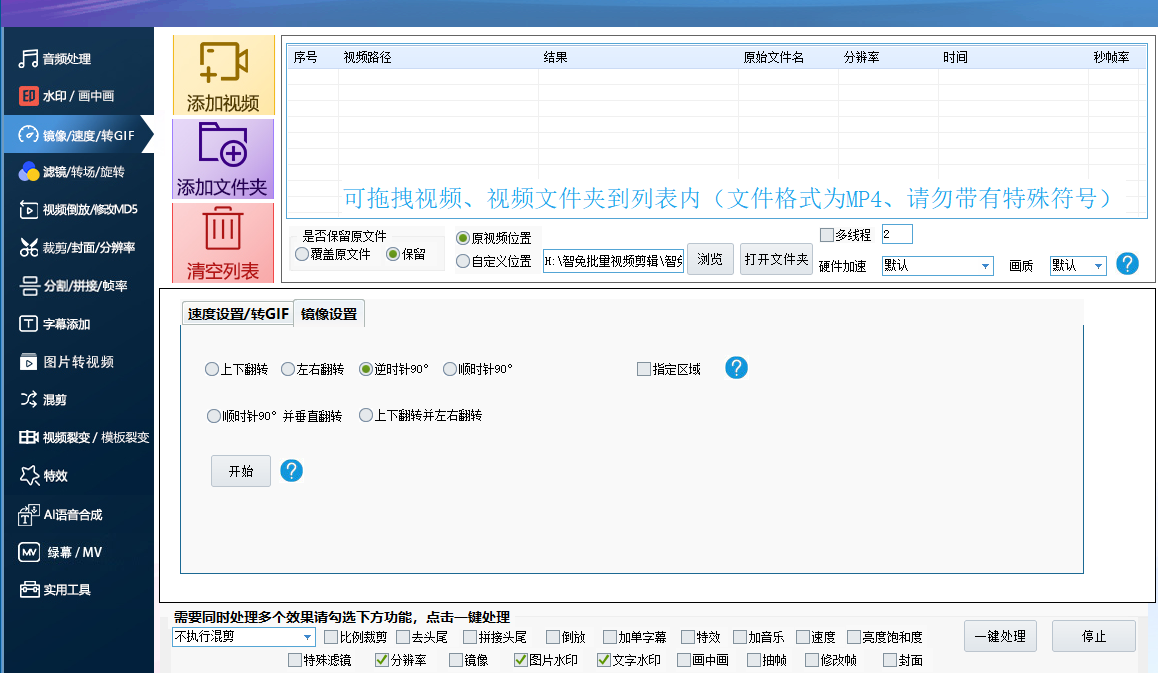 接着,将视频横版改为竖版需要的功能是“镜像设置”。导入视频后,在“镜像设置”的“顺时针90°”或“逆时针90°”勾选,点击“开始”,导出视频。导出后的视频同样在原视频文件的位置打包为一个文件夹。