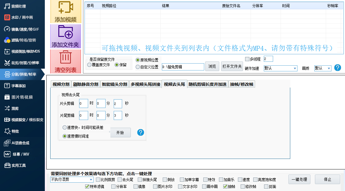 在“视频去头尾”这里,片头和片尾可以一次性去掉的时间是一样的,都是0s-59s,你想去掉多少秒,就在相应的片头或片尾输入几秒。