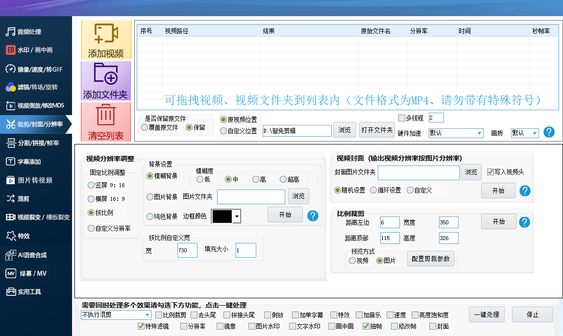 打开智兔剪辑,登录,点击左侧栏的“剪辑/封面/分辨率”,导入视频。首先,先看到“视频分辨率调整”,可调整的有:视频宽度、视频边框和视频颜色,在视频宽度输入数字,视频的比例不会改变,比如说,你导入的视频宽度是1000,高是800,宽和高的比例是5:4,那么你在视频宽度输入500,高就会变为400,随着数字的改变,比例不变,视频的分辨率也会改变,如果在“视频边框”输入数字,导出后的视频周围会有与你所选的视频颜色一样的边框。